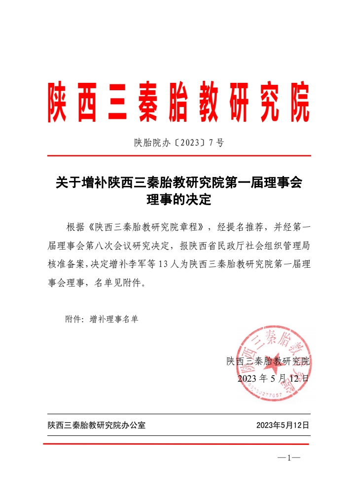 关于增补陕西三秦胎教研究院第一届理事会理事的决定